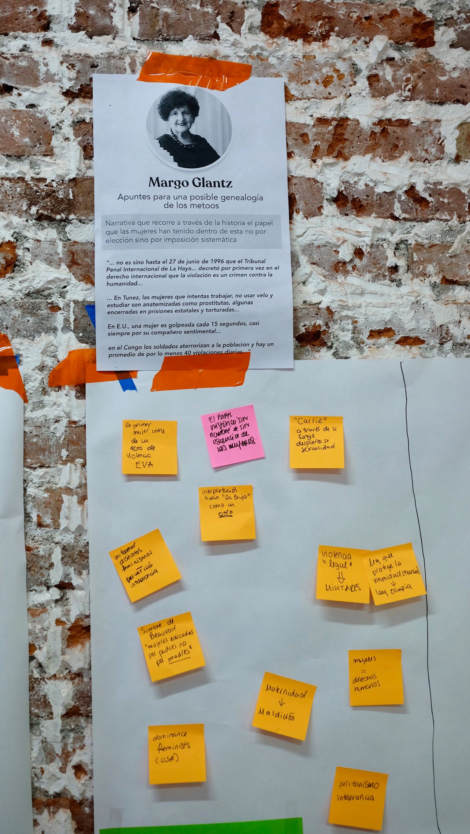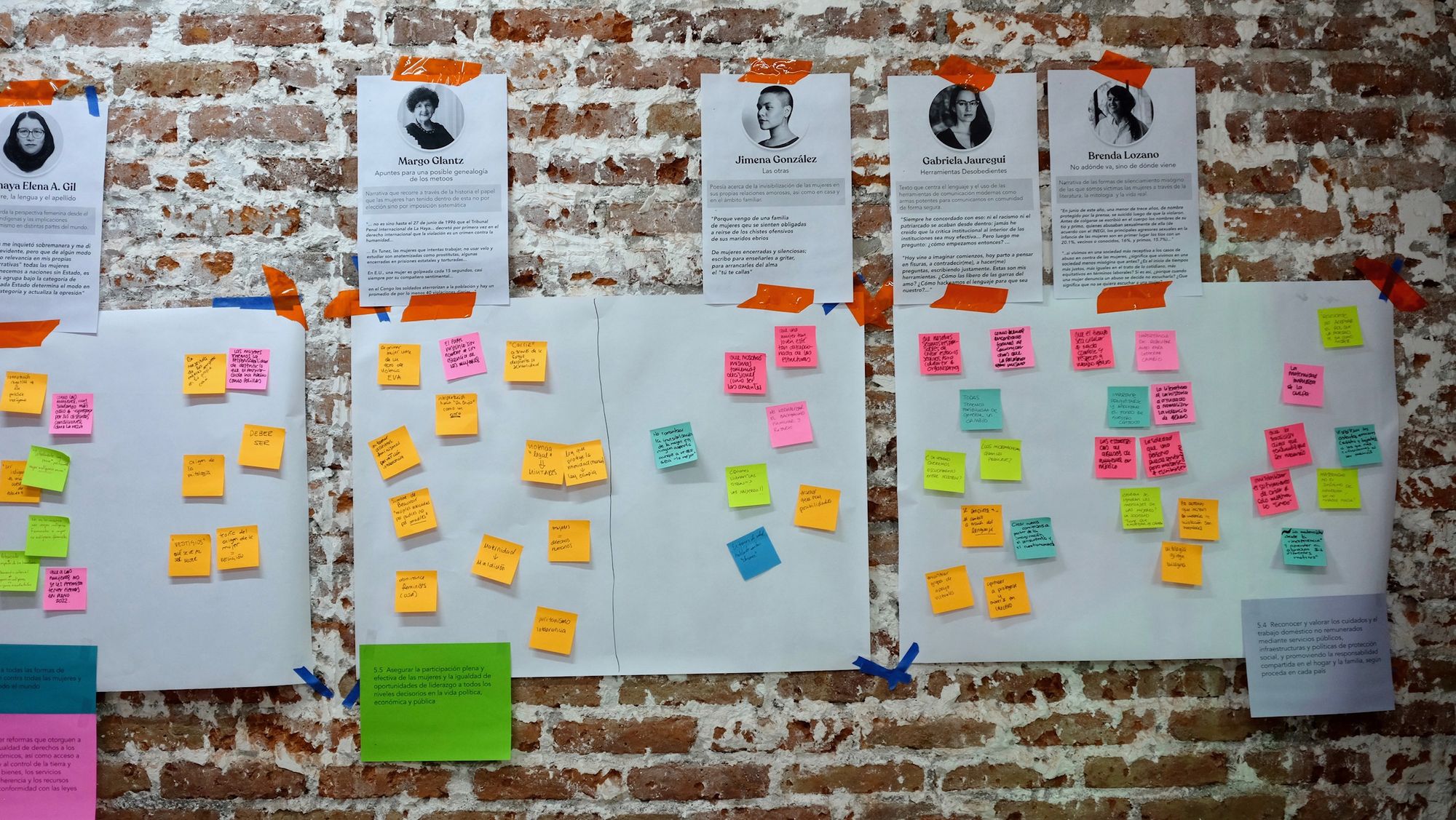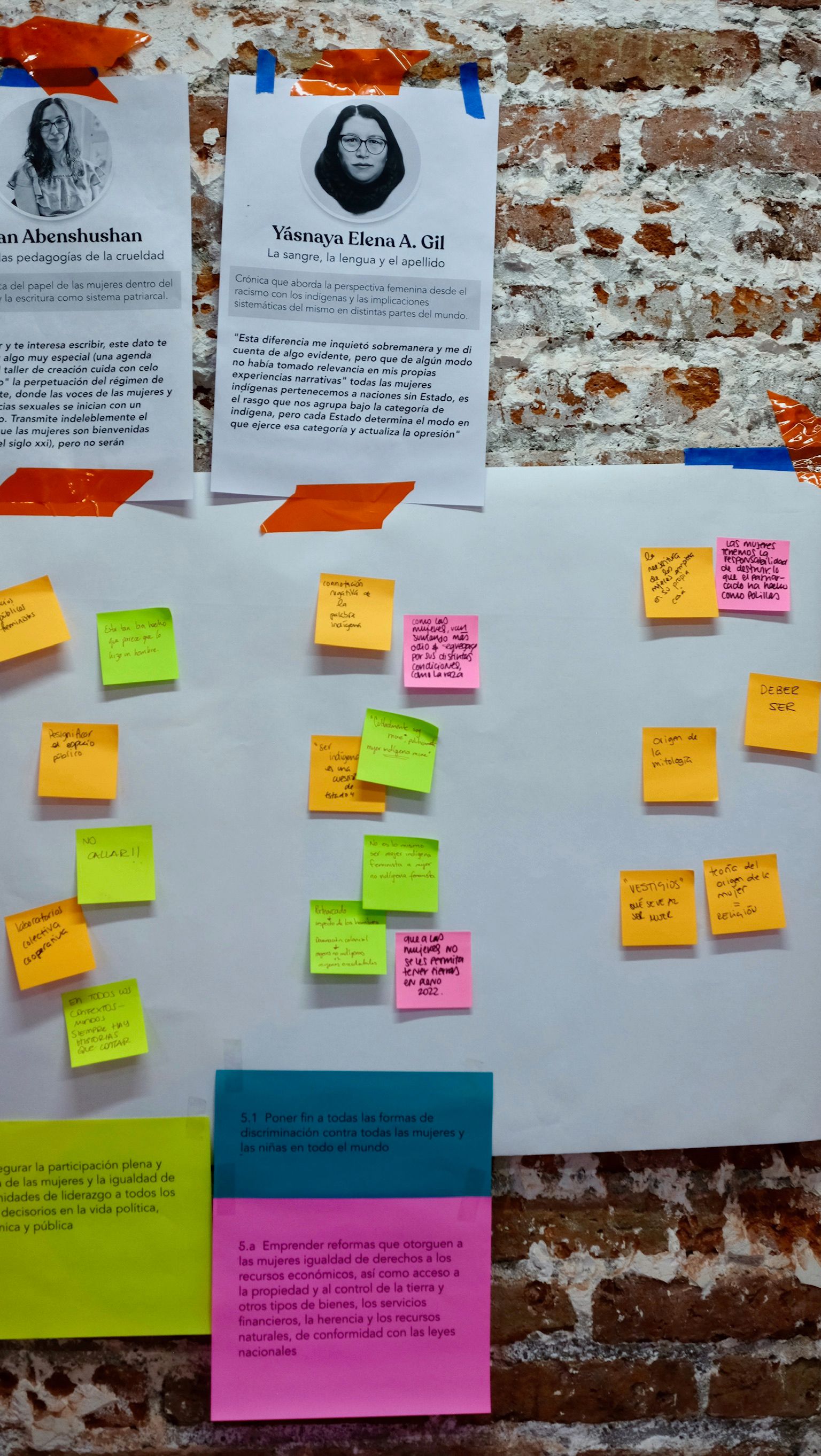 Cuando todos los espacios por texto estuvieron llenos de post-its con nuestras ideas, pasamos al análisis y conversatorio de cada uno de estos. Mientras íbamos revisando las notas y charlando sobre ellas, nos empezamos a dar cuenta de que muchos temas son transversales y nos afectan a todas las mujeres del país en distintas dimensiones y ámbitos de la vida. Charlamos sobre las mujeres indígenas, el papel de la colonización en la opresión patriarcal, la diversidad de los lugares desde donde viene la opresión y como se puede convertir en una especie de "multinivel", de la importancia de resignificar y royer (sí, de roído) los preceptos machistas tal y como las polillas royen la madera, sobre la importancia del movimiento #MeToo, de la maternidad romantizada y de lo que nunca te cuentan de ella, del estado, de como el estado está del lado de alguien más que no somos las mujeres y como nunca nos protege. 🤯
