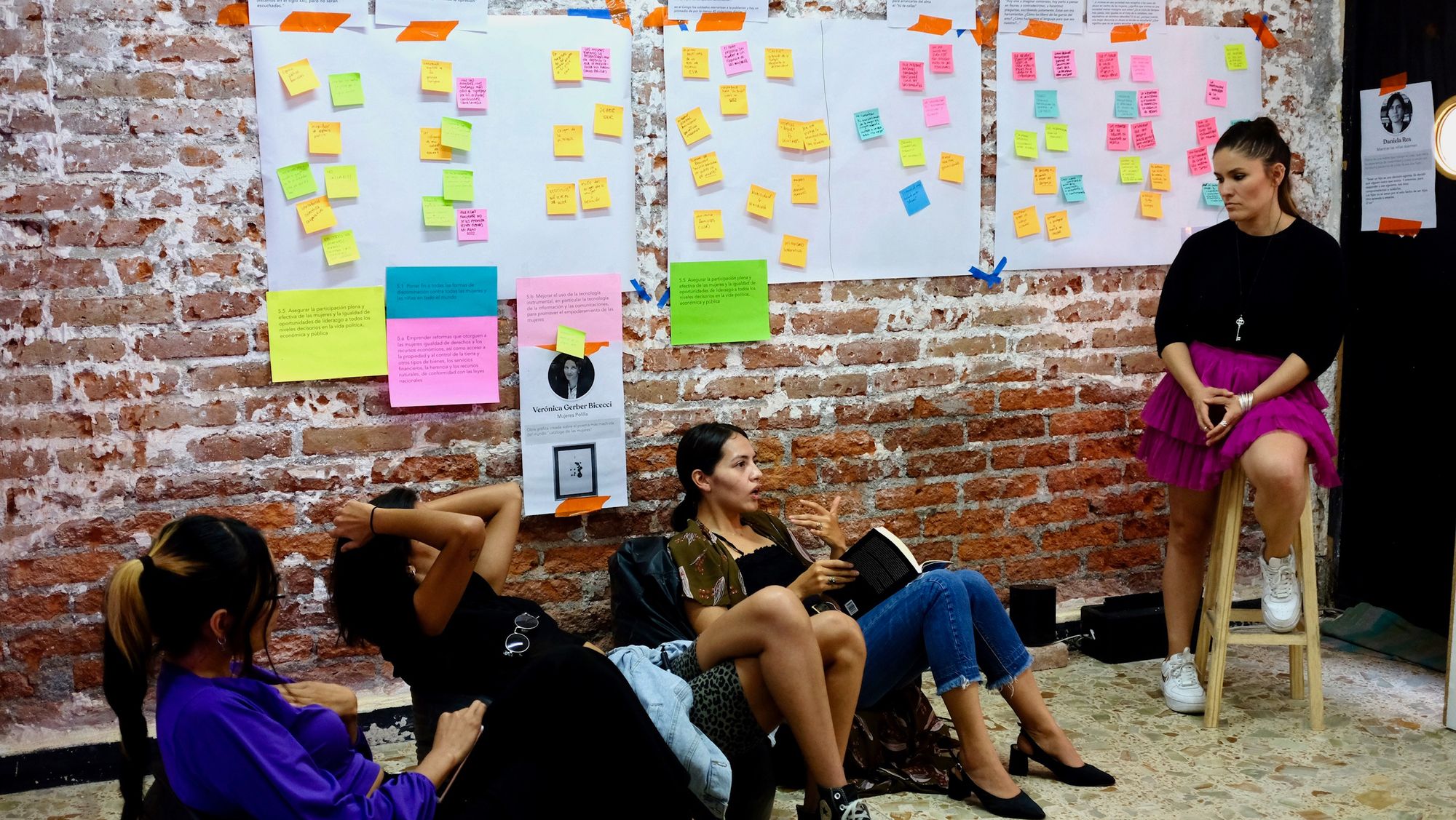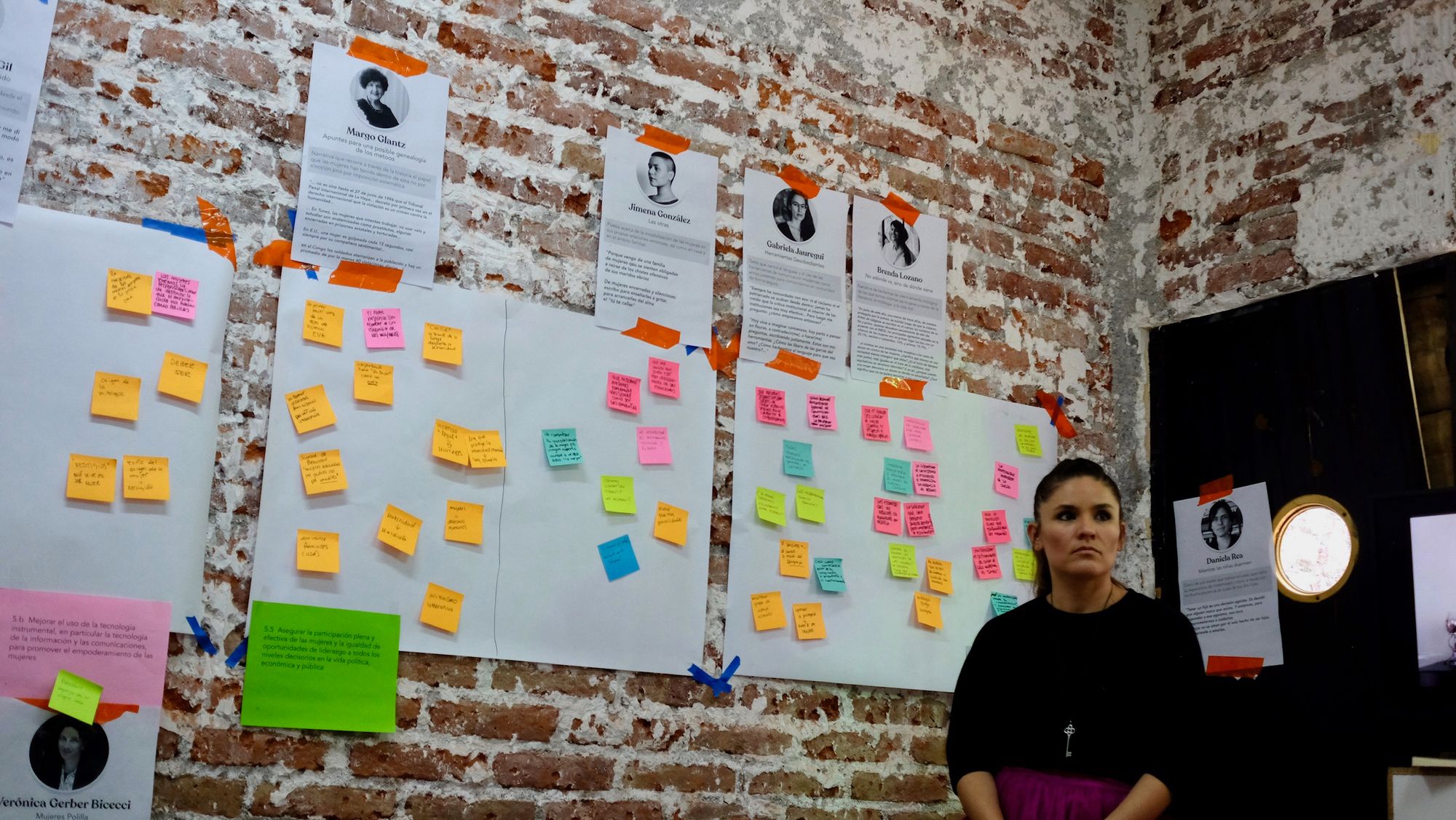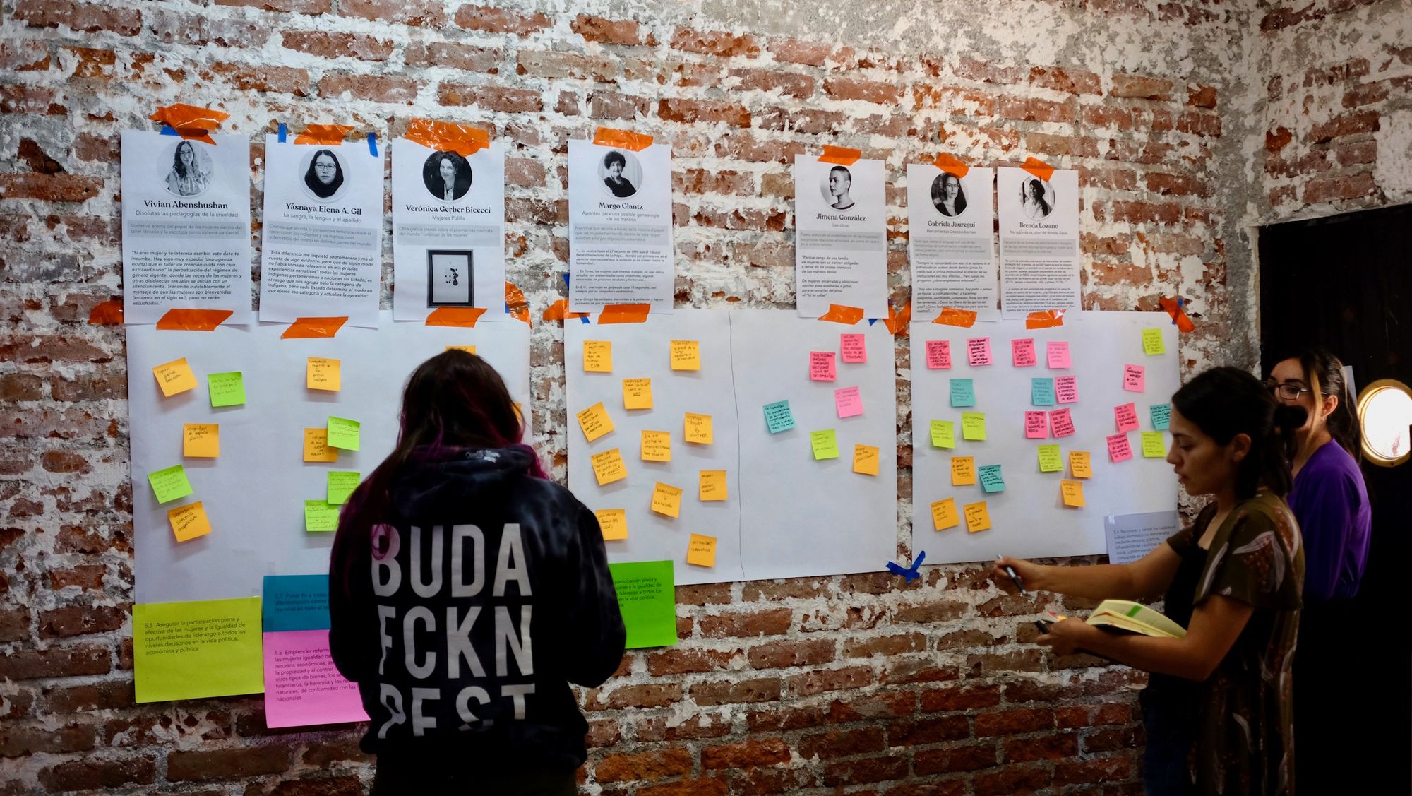 Cuando todos los espacios por texto estuvieron llenos de post-its con nuestras ideas, pasamos al análisis y conversatorio de cada uno de estos. Mientras íbamos revisando las notas y charlando sobre ellas, nos empezamos a dar cuenta de que muchos temas son transversales y nos afectan a todas las mujeres del país en distintas dimensiones y ámbitos de la vida. Charlamos sobre las mujeres indígenas, el papel de la colonización en la opresión patriarcal, la diversidad de los lugares desde donde viene la opresión y como se puede convertir en una especie de "multinivel", de la importancia de resignificar y royer (sí, de roído) los preceptos machistas tal y como las polillas royen la madera, sobre la importancia del movimiento #MeToo, de la maternidad romantizada y de lo que nunca te cuentan de ella, del estado, de como el estado está del lado de alguien más que no somos las mujeres y como nunca nos protege. 🤯