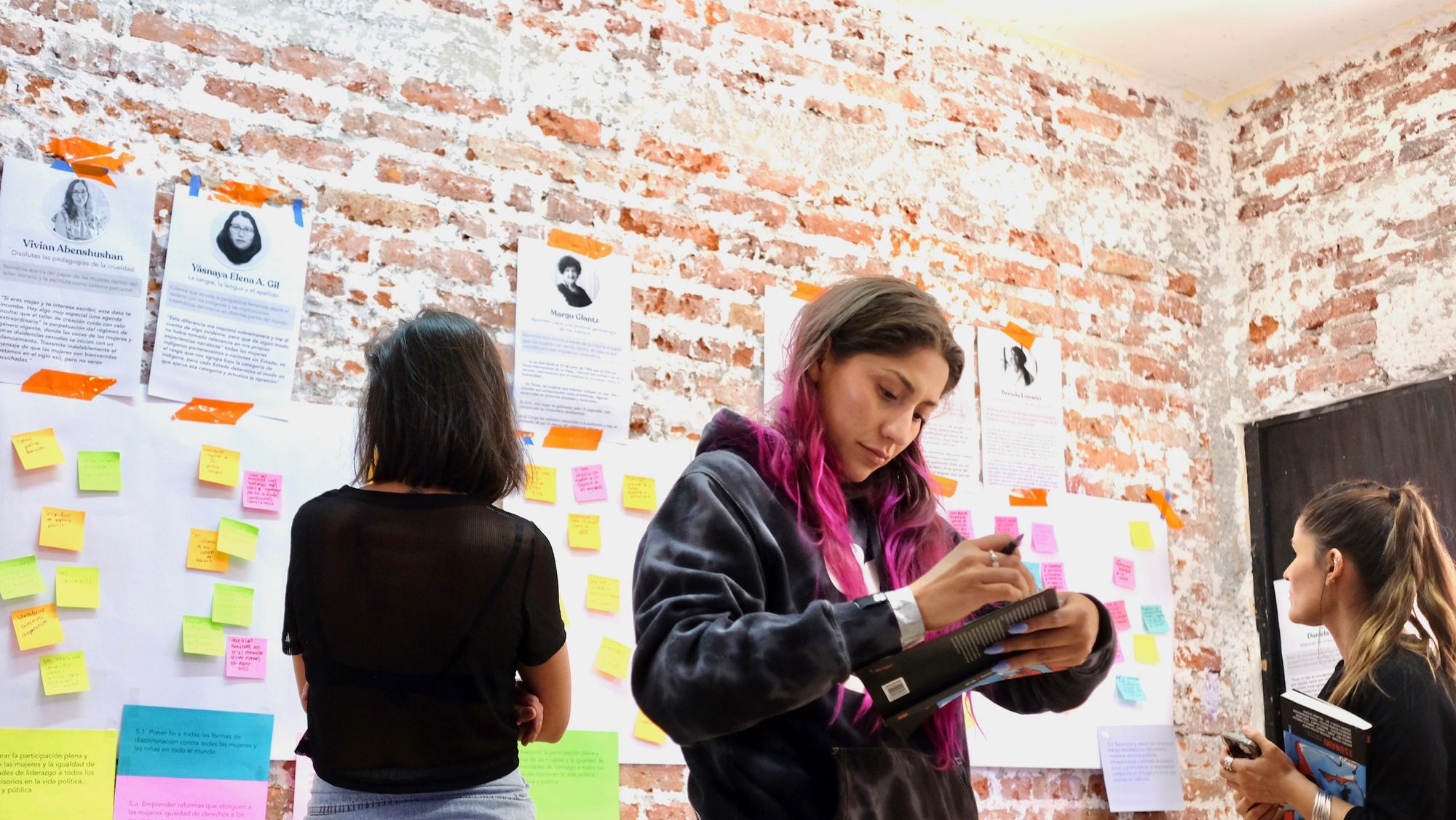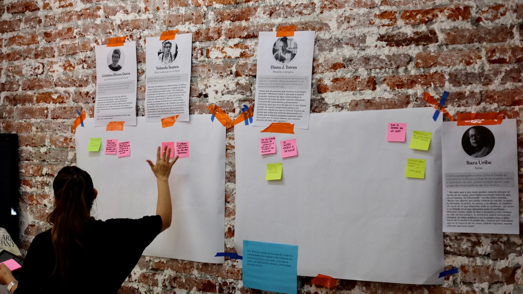 Después de esto, fuimos directo a la actividad, en la que utilizando herramientas de Design Thinking (por qué diseñadora de experiencia), hicimos el ejercicio de vaciar en un post-it cada idea que nos resonara sobre lo que leímos en los 12 textos que conforman en libro, que van desde diarios, poemas, relatos, ensayos y hasta obras de arte visual. Trabajamos en equipos para repartirnos de forma organizada el espacio y el tiempo, siempre buscando que todas pudiéramos expresar lo que nos había movido cada una de las lecturas.