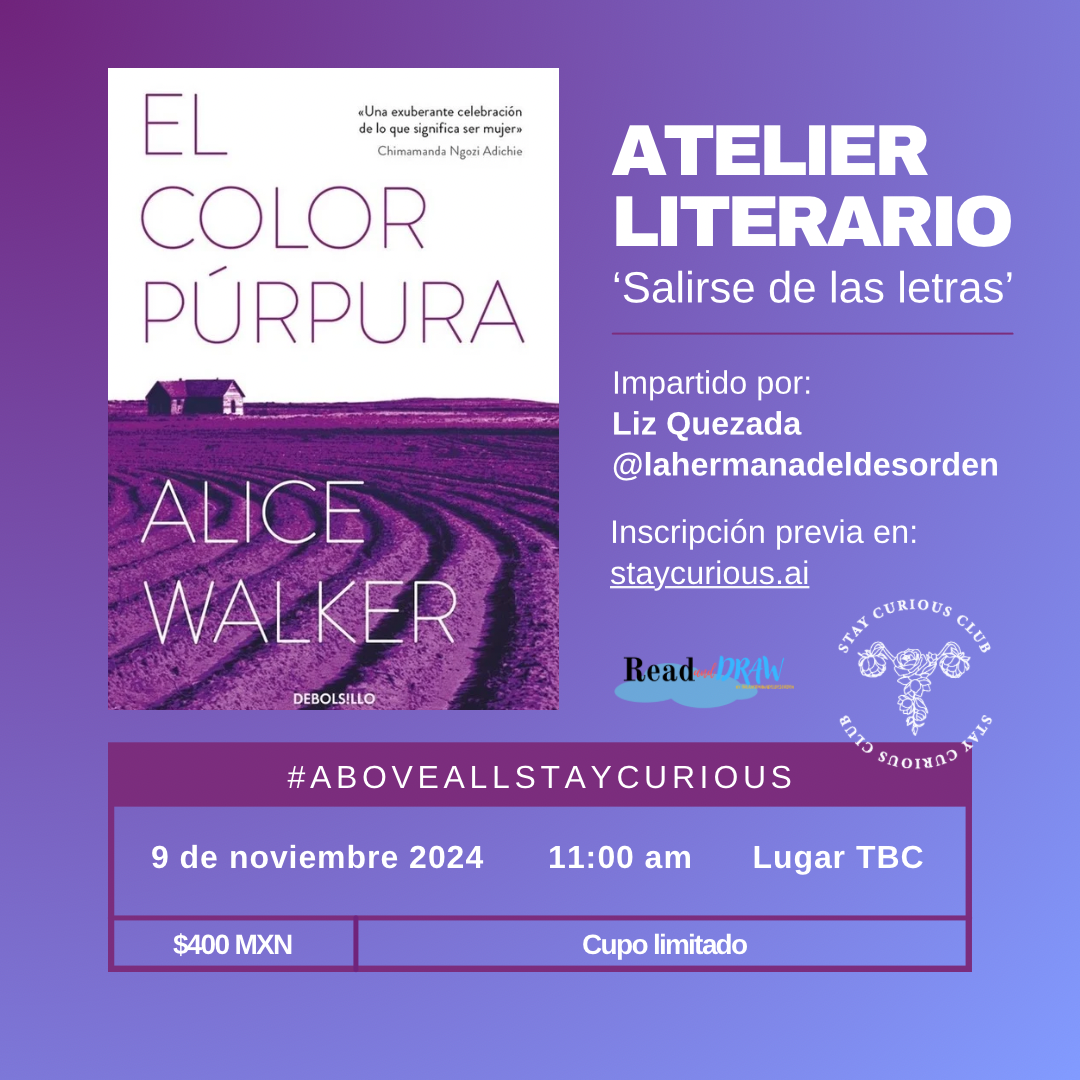 Nuestro atelier literario “Salirse de las Letras" se llevará a cabo el próximo 9 de noviembre en El Desastre, Librería, en donde exploraremos un libro seleccionado por nuestra comunidad: "El color púrpura" escrito por Alice Walker.