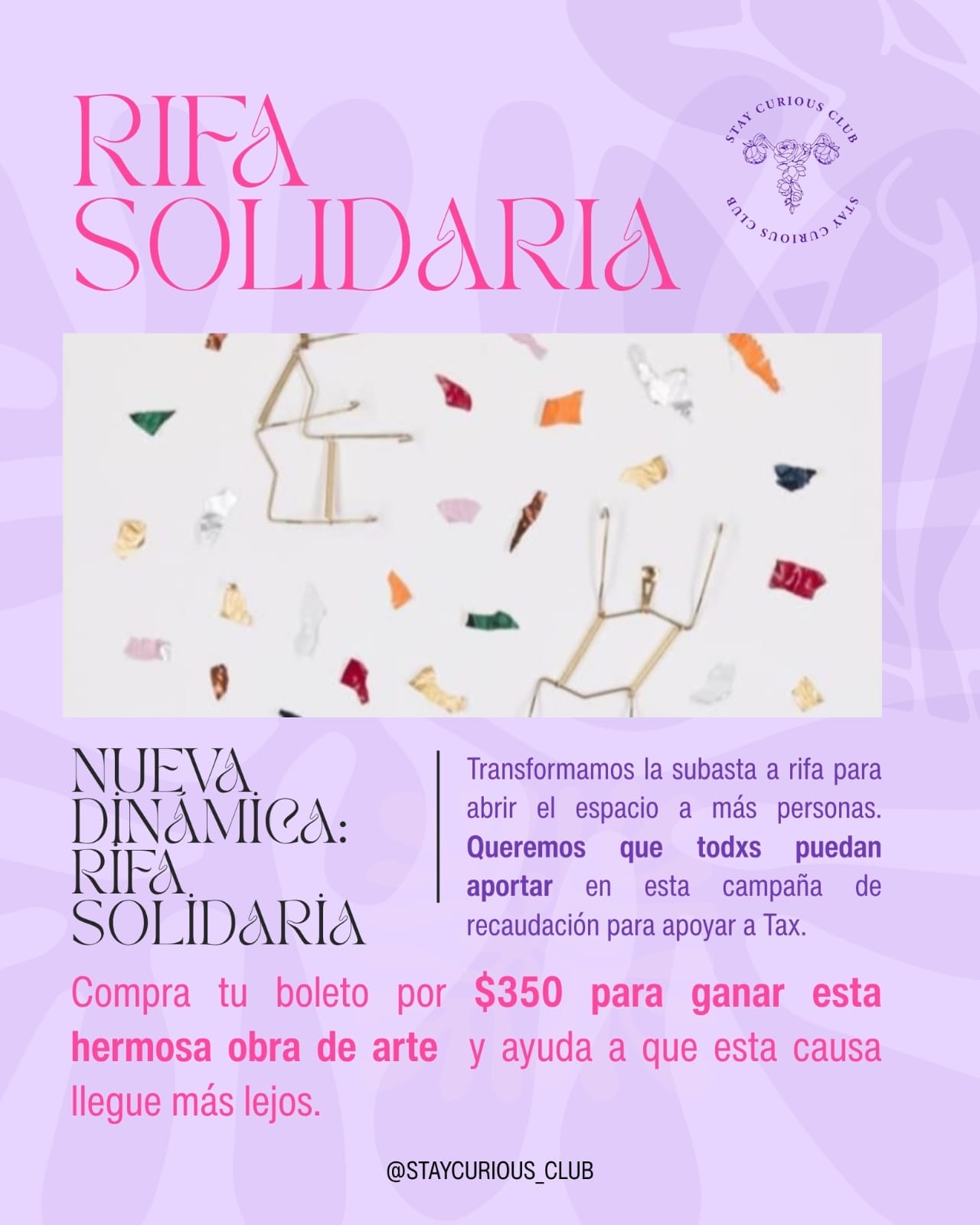 Tax ha sido el corazón visual de Stay Curious Club: sus registros, fotografías y reels han capturado nuestra esencia y compartido nuestros sueños. Hoy, que ella comienza una nueva etapa de sanación, queremos acompañarla como ella lo ha hecho con nosotrxs: con cuidado, cariño y creatividad. Tax es artista, soñadora y luchadora incansable. Su fuerza nos inspira y su historia nos une. Esta rifa es una forma de seguir tejiendo una red de apoyo y gratitud alrededor de ella. 🌿