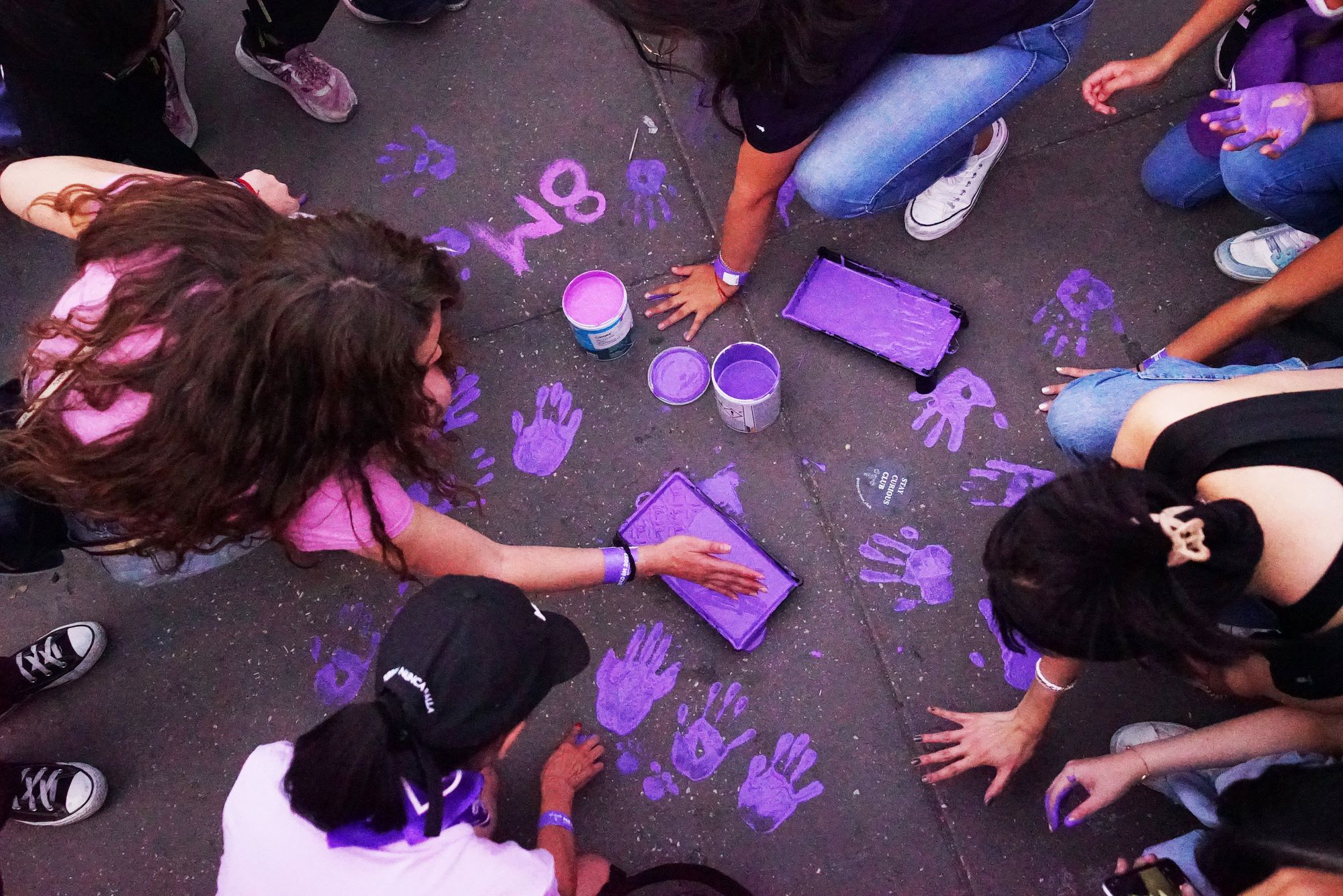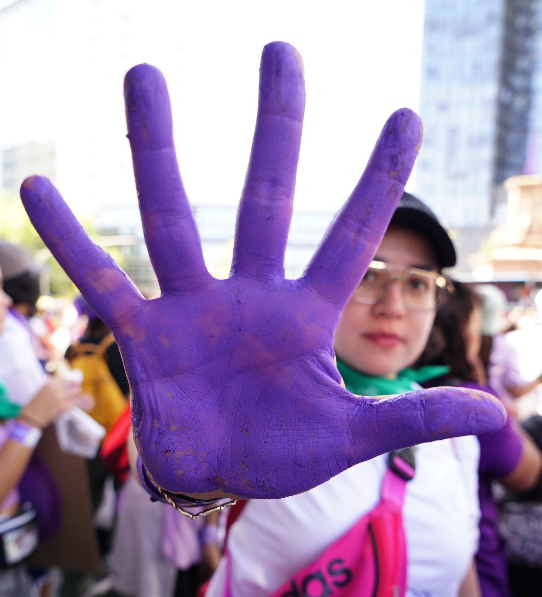 Avanzada la tarde, en el recorrido rumbo al zócalo nos detuvimos para realizar un ejercicio donde pintamos nuestras manos de morado y dejamos una huella por aquellas mujeres que ya no podían hacerlo. Varias integrantes utilizaron el megáfono para nombrar alguna mujer asesinada o enunciar el motivo por el cual dejaban su huella. “Libertad” dijo una, “por todas” mencionó otra. Yo pinté mi mano y mientras dejaba mi huella, en mi pensamiento recordé a Karla, una compañera de la licenciatura que fue asesinada a balazos mientras salía del gimnasio por su novio, exnovio o alguien que intentaba serlo. Nunca se supo con certeza.